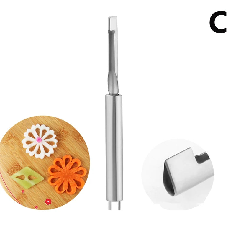 Create stunning food presentations with this stainless steel carving knife set. Designed for fruit and vegetable decoration, these semicircle, water drop, and petal-shaped tools help you turn everyday ingredients into beautiful culinary art.