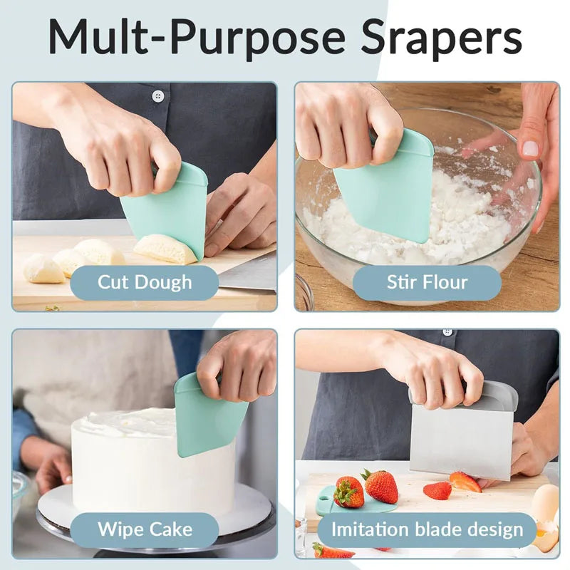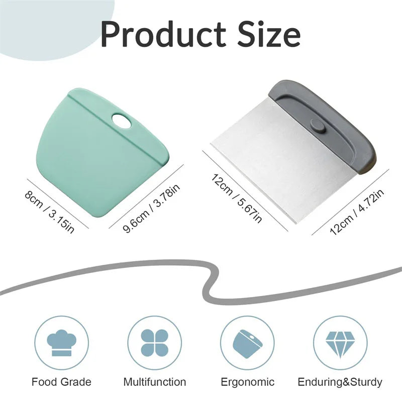 I use this scraper set for shaping pizza dough, dividing bread dough, and scraping batter from bowls. The flexible silicone scraper reaches every corner, while the stainless steel scraper handles chopping and cutting efficiently.