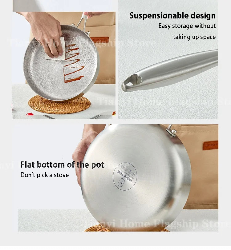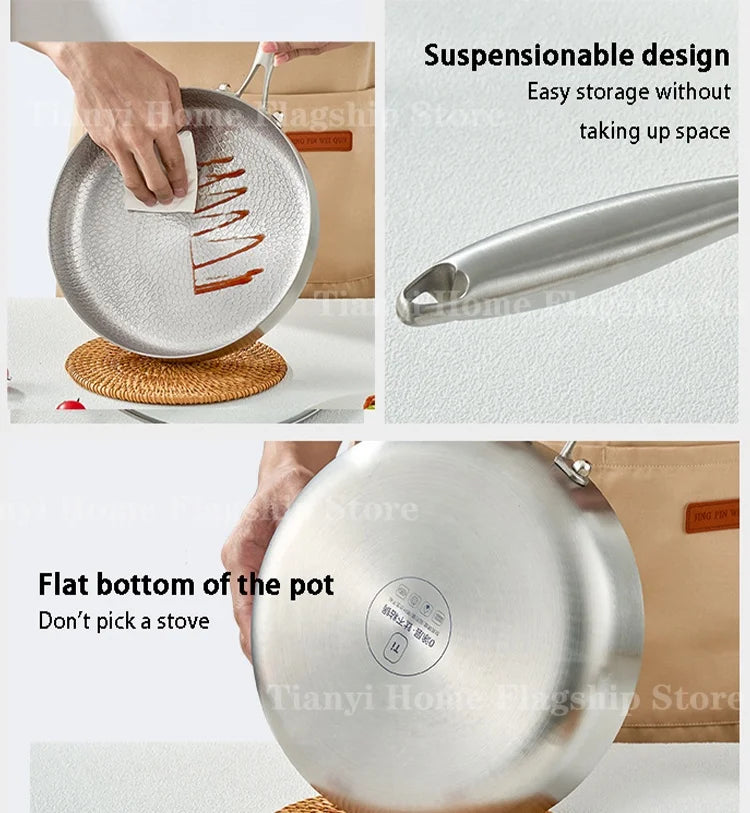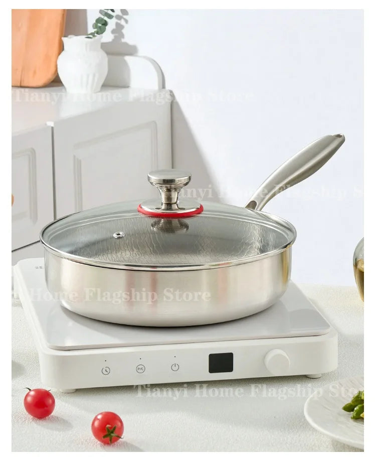 Cook with ease and precision using this titanium stainless steel frying pan, designed for everyday home cooking. With a durable non-stick surface and lightweight build, itβs perfect for frying eggs, searing steaks, and quick wok-style meals on both gas and induction stoves.