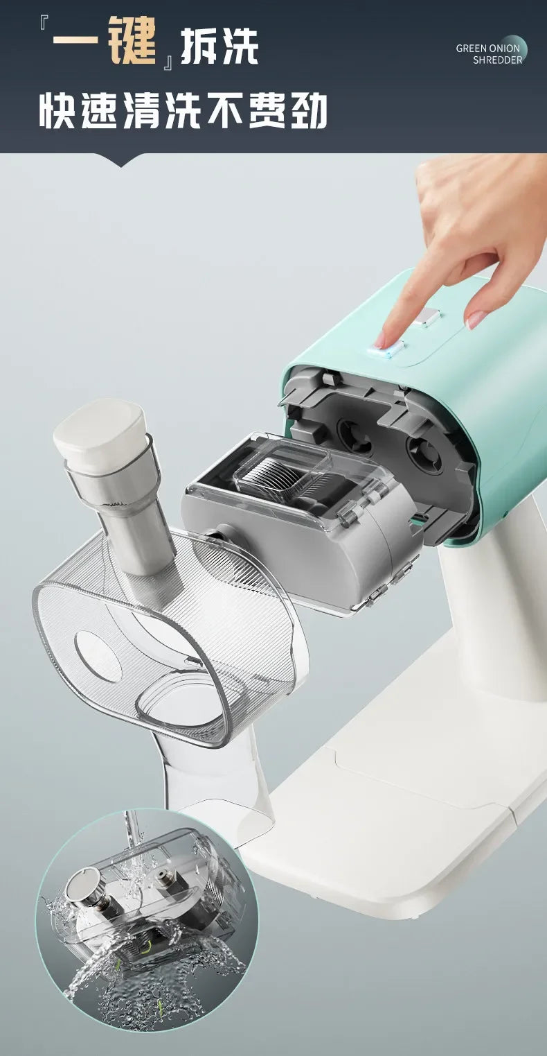 I connect the shredder to power, feed in scallions or vegetables, and the machine automatically produces finely shredded pieces, saving hours of manual prep.