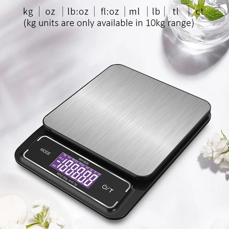 Instantly switch between kg, oz, lb, ml, fl oz, tl, and ct for flexible measuring (kg unit available in 10kg range).