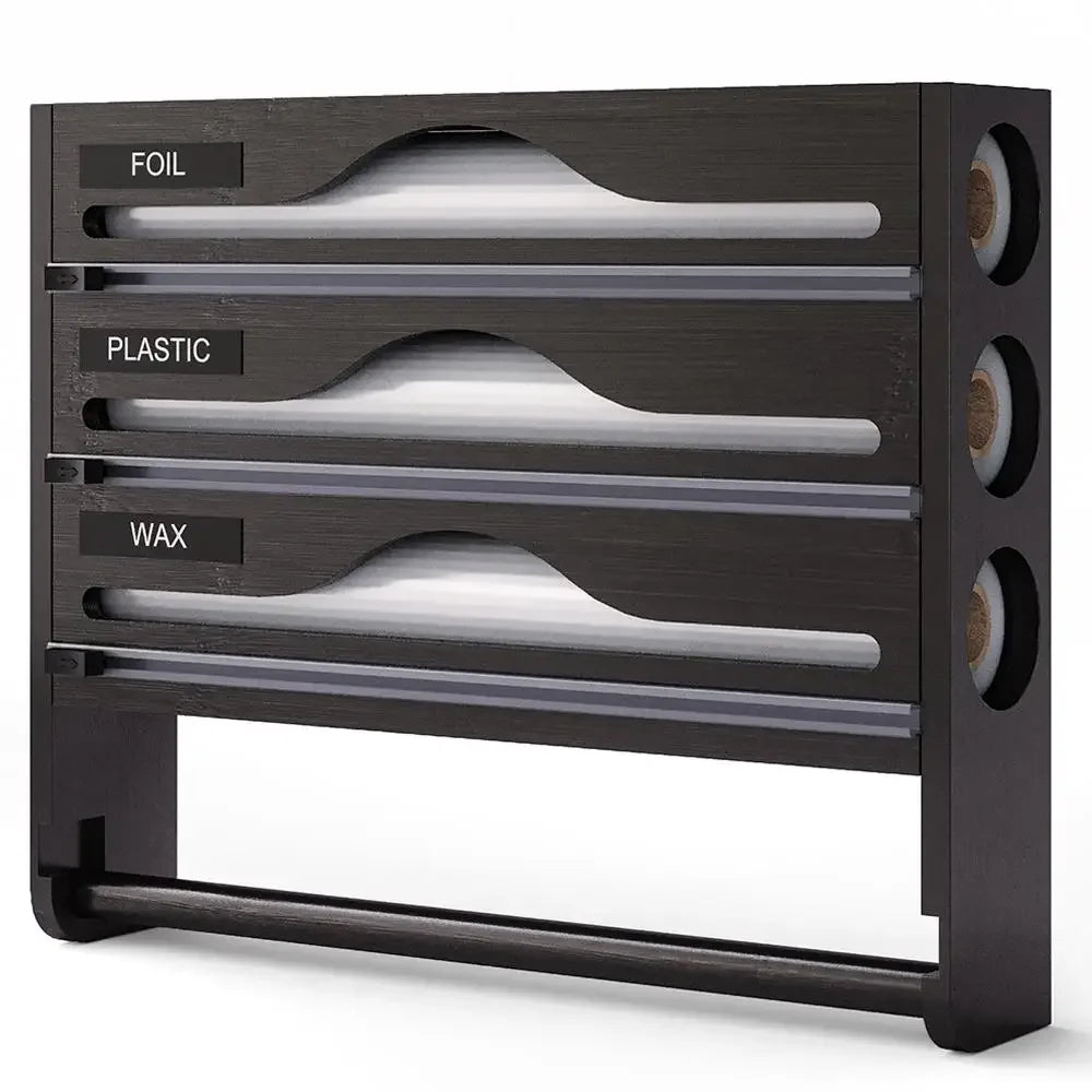 I store cling film, aluminum foil, and wax paper in the respective slots and keep a paper towel roll on top. It saves countertop space, and every cut is clean and precise, making meal prep quick and efficient.