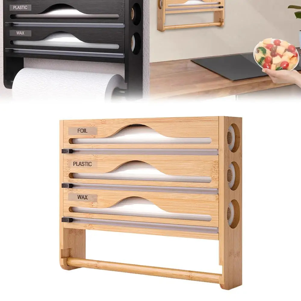 Keep your kitchen tidy and efficient with this bamboo multi-slot dispenser. Designed to hold cling film, foil, wax paper, and a built-in paper towel holder, it provides clean cuts, easy access, and a stylish countertop solution.