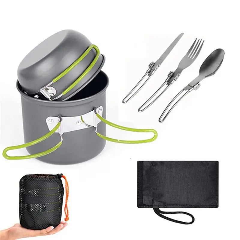 Includes 2 camping pots, 1 cutlery set, and 2 storage bags — everything you need for outdoor meals.