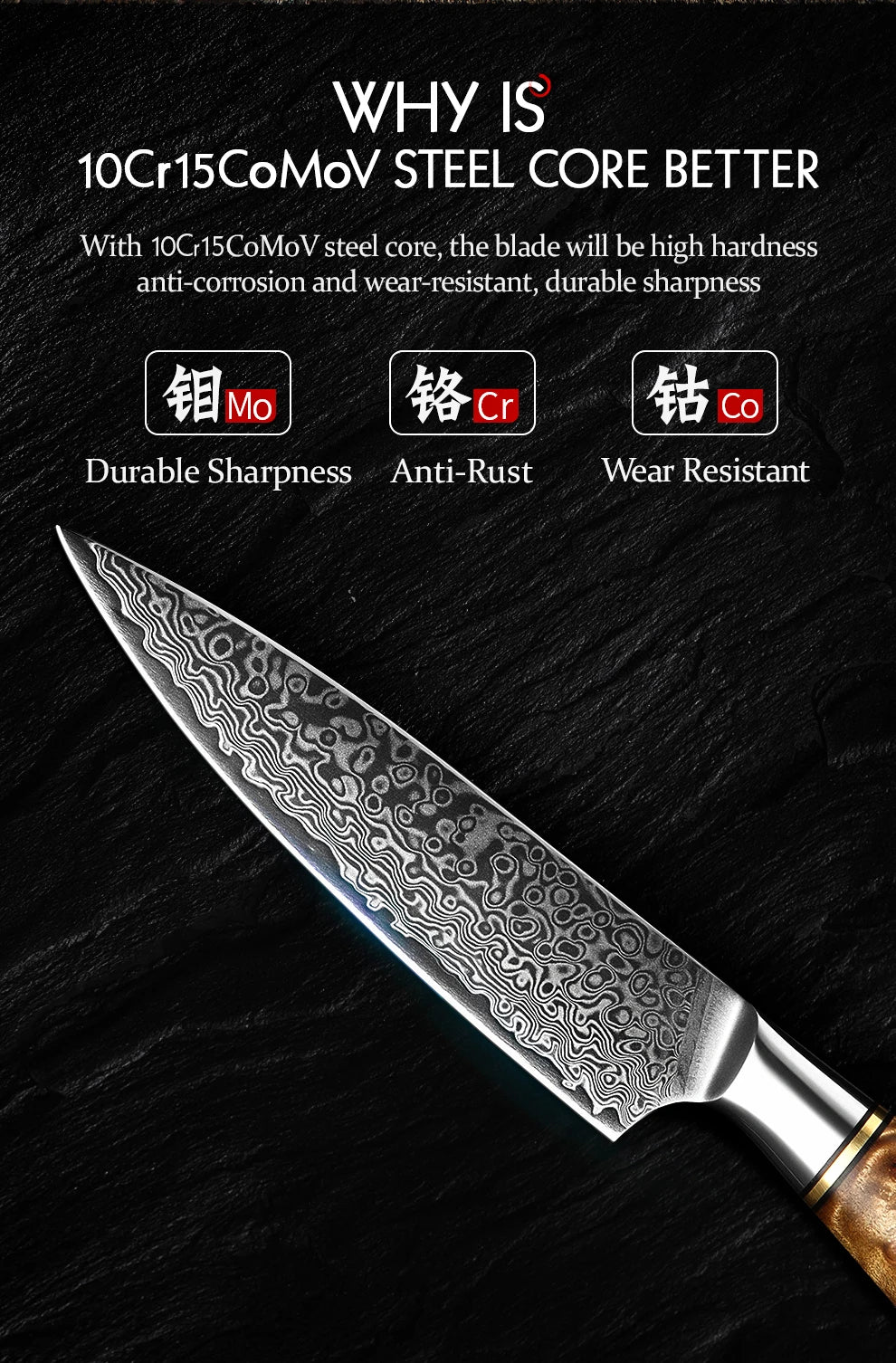 Premium Damascus construction with a 10Cr15CoMoV core ensures superior strength, edge retention, and a stunning natural pattern.