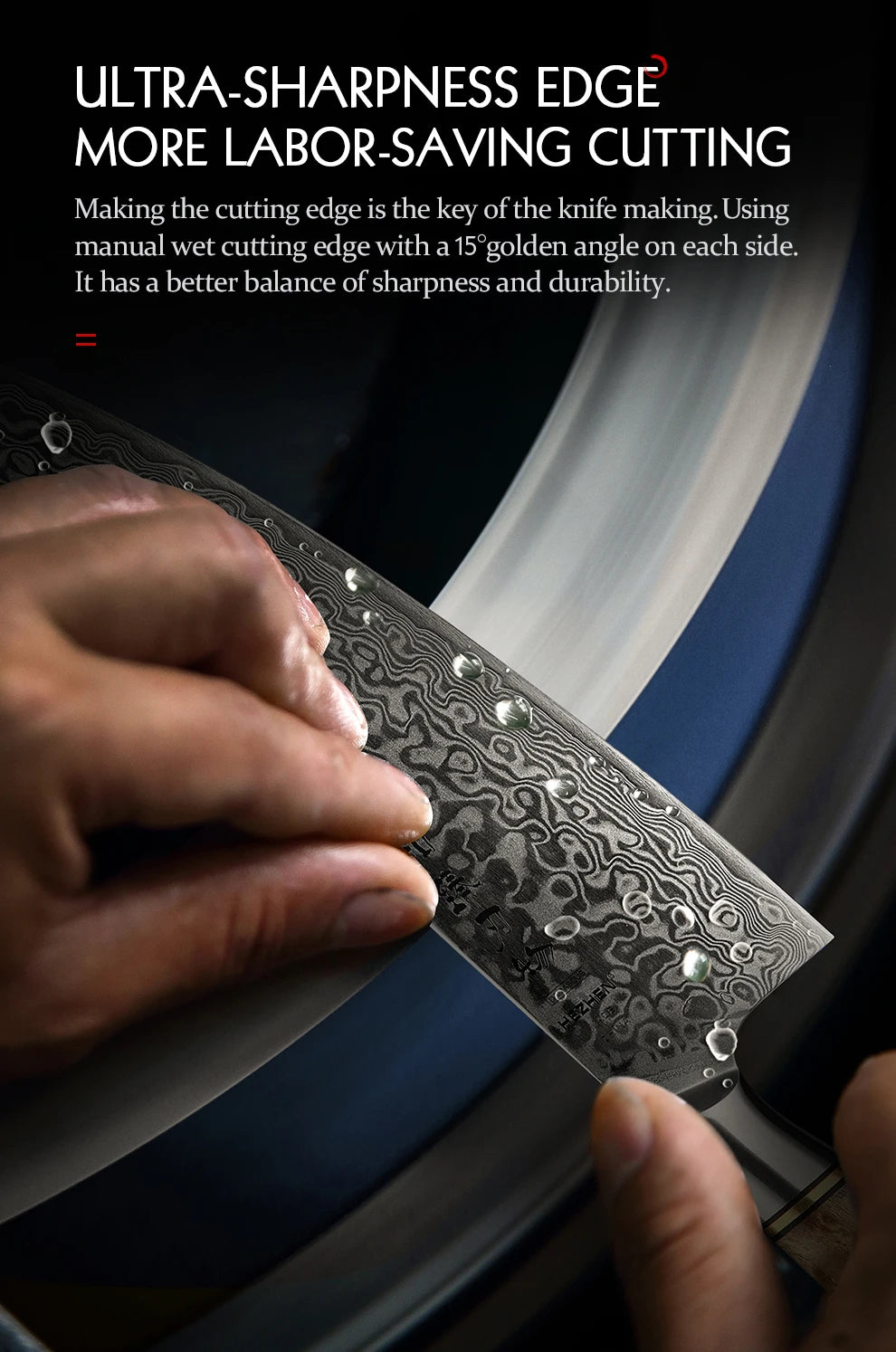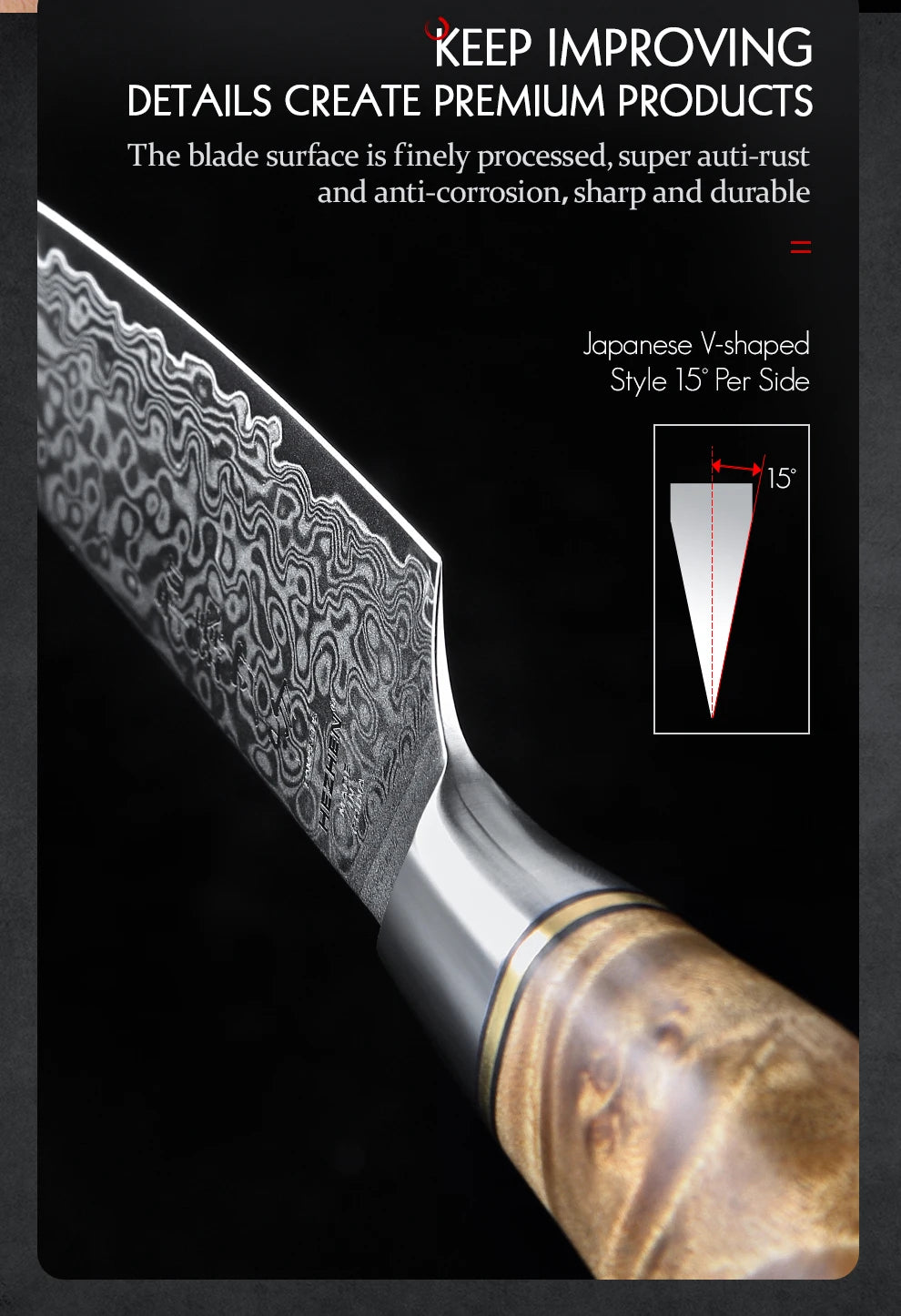 Vacuum heat-treated blade with 60–62 HRC hardness and a 15° edge per side delivers effortless, clean cuts.